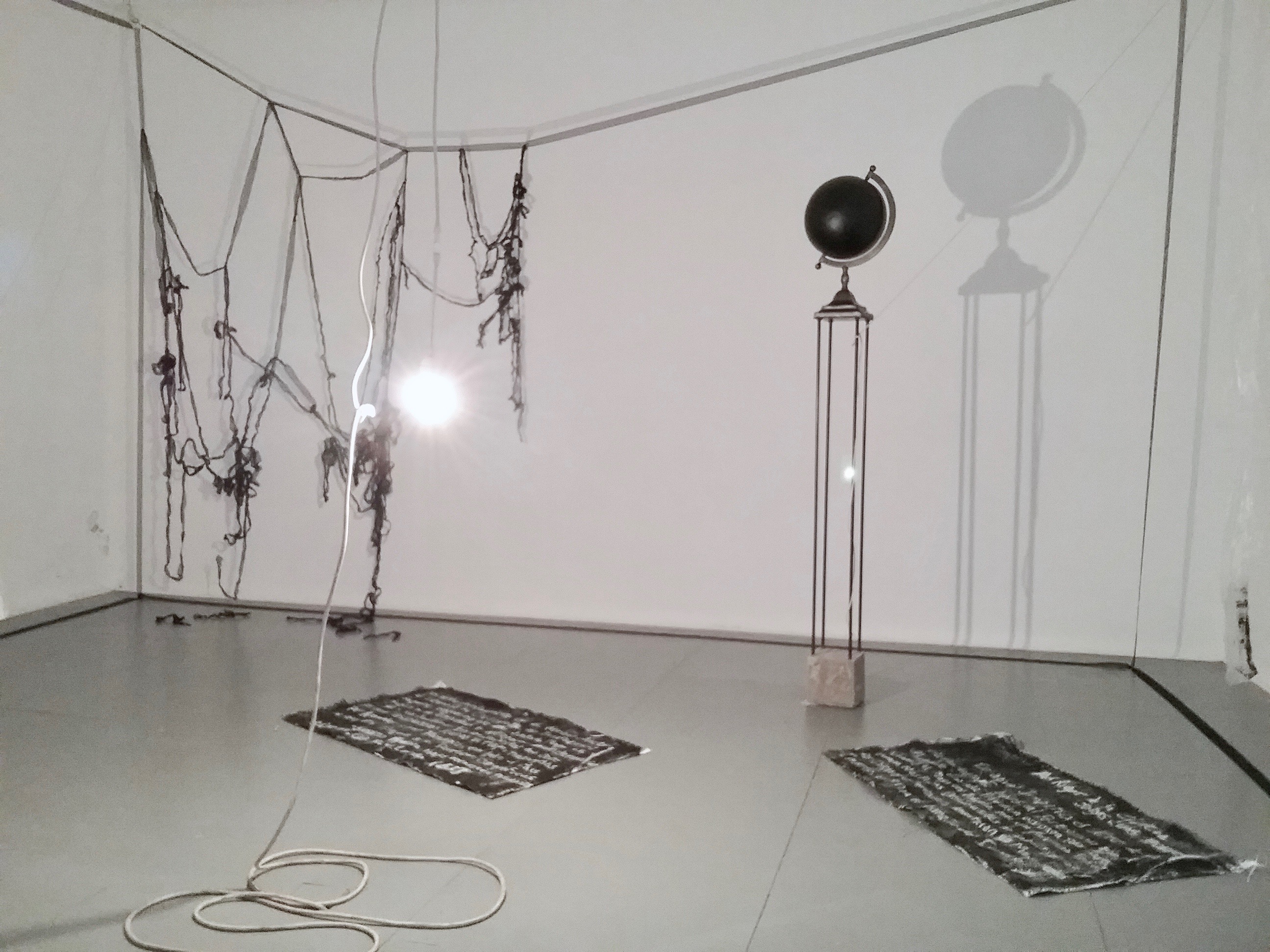 A fragile/mutable/theatrical rig of pulleys and guy wires and strips of fabric define the space and opens the third wall to the street. Gossamer ladders made of shredded plastic blow in the wind and a blank black globe sits high on a pedestal. Passers by helped create linear maps and help distort them with torque and tension, rag garments were reconstructed, and stories written. A participatory exploration into the shifting migration of self and place. Personal stories were contributed and written by passers by on discarded tarps and the general public helped mend rag garments.
